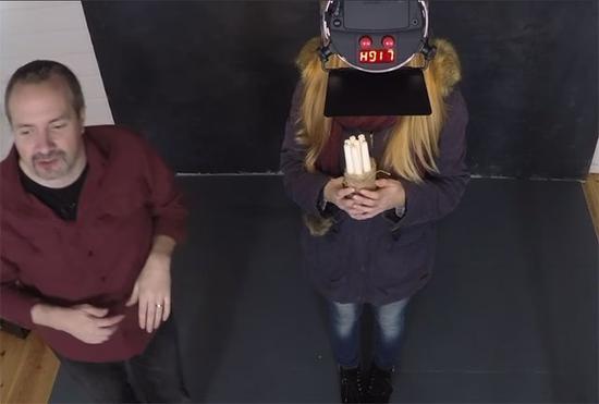 第一步,要进行光线测试和布置。拍摄在一张灰色背景前进行,先从一只蜡烛开始进行光线测试,拍摄结果和技术值如图所示: