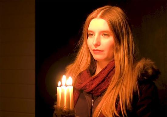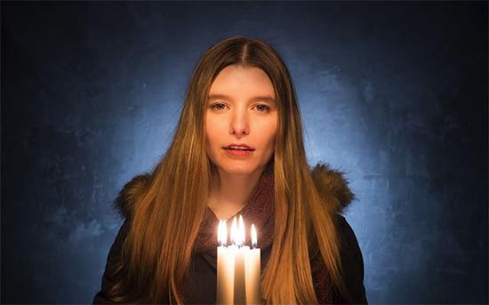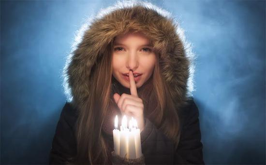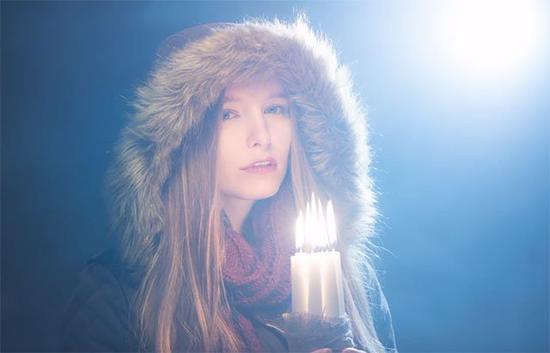 画面原素并不复杂,皮草装扮与飞雪和冷色背景营造出冬天的氛围,而烛光与模特的脸色形成温暖的主调。
