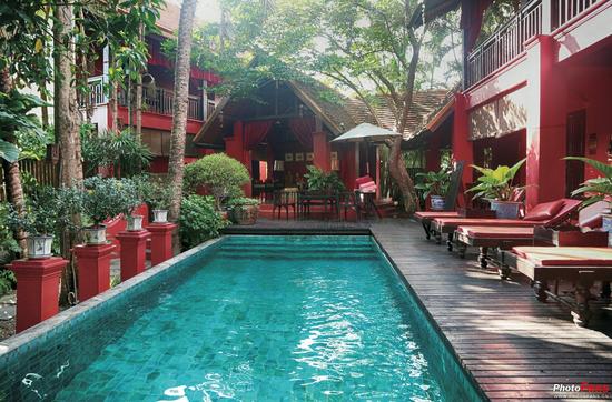 拍摄民宿大的环境,要注重画面的疏松通透感觉。摄影师利用游泳池作为主要景物,所有的建筑、花草树木和休闲长椅都围绕游泳池展开;而游泳池又减少了画面的拥挤感。