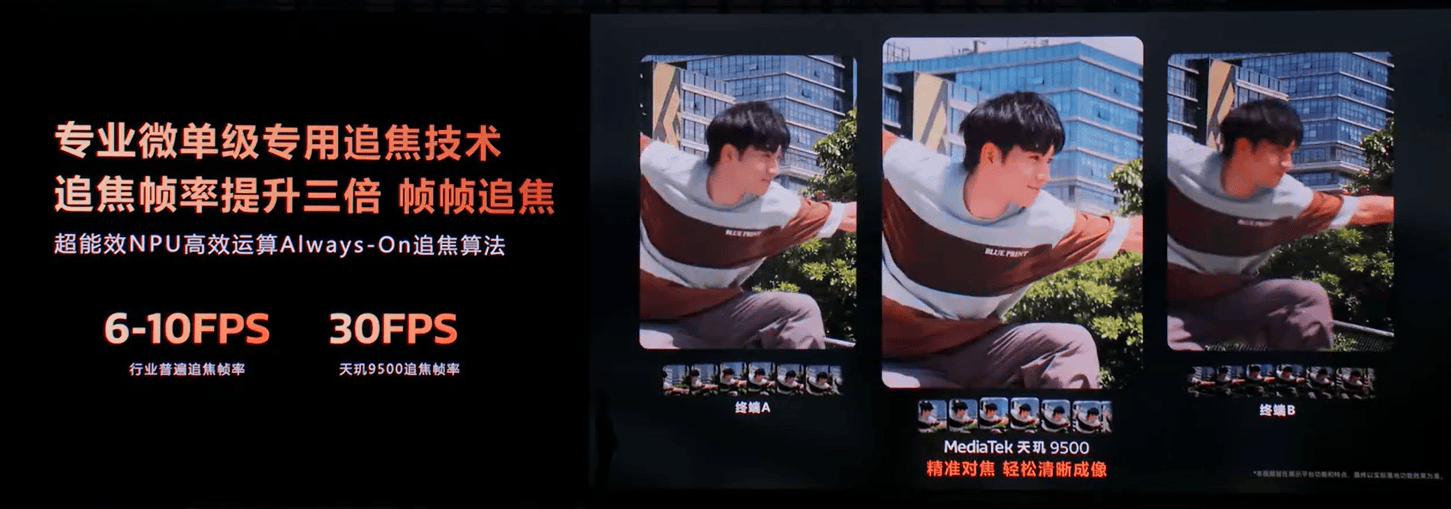 强画质之外,还要强抓拍。以往手机在运动场景里容易“对不稳”,本质是功耗与算力受限导致只能在少数帧数上实时对焦。天玑9500的超能效 npu 可低功耗全时运行追焦算法,将行业常见 6–10 帧提升至业界领先的 30 帧/秒持续追焦,从日常遛娃到极限运动,关键时刻不再虚焦失手。