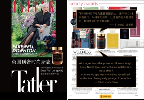 (epigen12™时空定龄素被英国顶奢杂志《tatler》评为「2025年度最佳美容与长寿产品」)