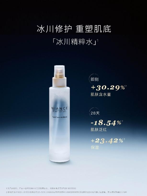 niance源于瑞士阿尔卑斯山脉的极地冰川。在这里,科学家们发现了一种在极端环境下依然能保持高能量代谢与自我修复的微生物——这一发现,成为niance的灵感起点——品牌将这股“细胞能量”引入现代生物学抗衰研究,将其凝练为品牌灵魂成分——「冰川焕能再生因子」,让冰川的生命密码化为细胞由内而外焕活的力量。